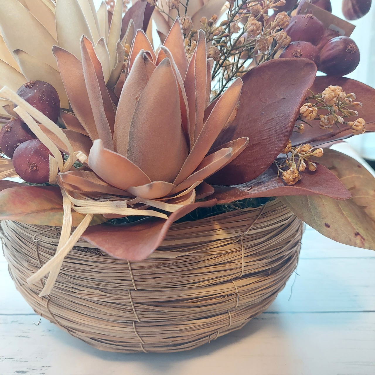 ボタニカルアレンジは、多彩なアーティフィシャルフラワーを用いた、大きなサイズ感ではありますが、落ち着いた色合いのアレンジメントです。その自然を感じさせるボタニカルな雰囲気は、リビングや玄関、オフィスのデコレーションに最適で、どんな空間にもマッチします。大きなサイズならではの存在感があり、見る人に心の安らぎを与えること請け合いです!
